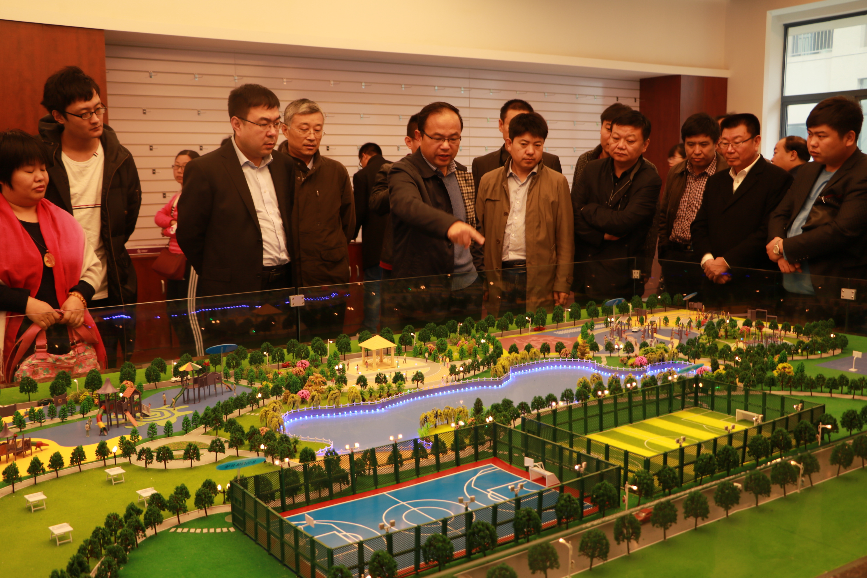First they visited our exhibition hall. Mr. Chen introduced our product series and current marketing. He specially pointed out our strategy of being advanced fitness equipment and fitness solution supplier. At the same time, he also present our new products--multi-funtion venue and sports parks.