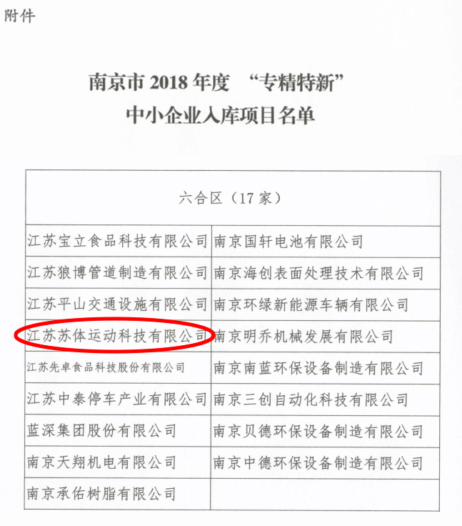 近日,江苏苏体运动科技有限公司成功通过南京市2018年度“专精特新”中小企业认定。